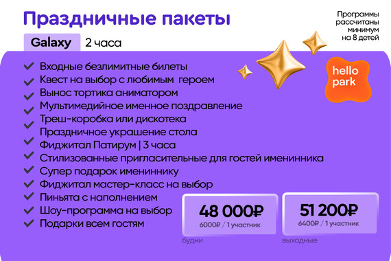 В программу входит: – Площадка Активити парк (1 час с аниматором) – Аренда Комнаты дней рождения – Сопровождение любимого героя и вынос торта (1 час) – Безлимит на площадку Активити парк (без аниматора)