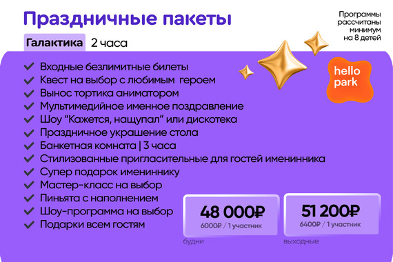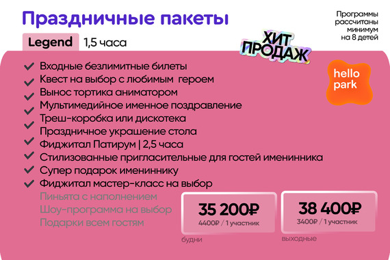 ПРОГРАММА | 2 часа развлечений на площадках на выбор: – Активити парк (рост до 155 см) | от 30 минут – Скалодром (от 11 кг) | 30 минут – Веревочный парк (рост выше 135 см) | 1 час – Мастер‐класс | 30 минут – Hello Park | 30 минут – Лазерный лабиринт | 30 минут – Банкетная комната | 1 часк