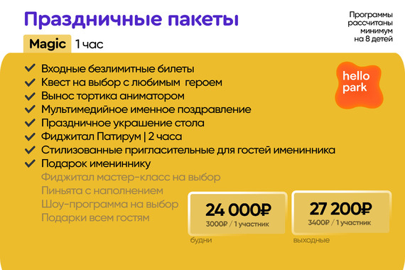 Ваш праздник в парке будущего! В Hello Park — в одной праздничной программе: интерактивные проекции, квесты с дополненной реальностью и любимые аниматоры. Только здесь привычные игры соединяются с цифровыми!