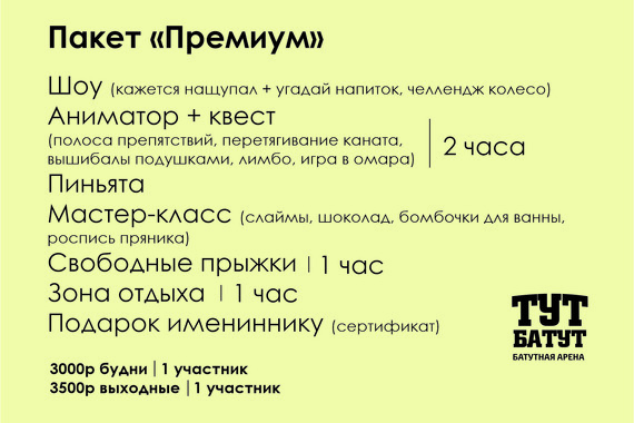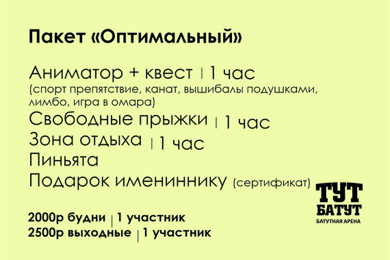 В пакетное предложение входит: – Три площадки на выбор | по 30 минут (VR Arena, веревочный парк, скалодром, Тут Батут, Активити парк) – Аренда комнаты Дней Рождения – Сопровождение любимого героя и вынос торта (1,5 часа)