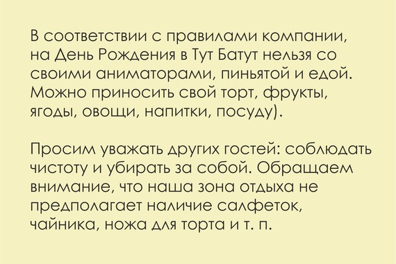 Обращаем внимание, что в соответствии с правилами компании, на День Рождения в ИграMIX нельзя со своими аниматорами, пиньятой и едой. Можно приносить свой торт, фрукты, ягоды, овощи, напитки, посуду.