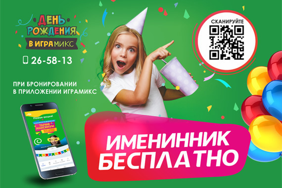 Обращаем внимание, что в соответствии с правилами компании, на День Рождения в Играмикс нельзя со своими аниматорами, пиньятой и едой. Можно приносить свой торт, фрукты, ягоды, овощи, напитки, посуду.